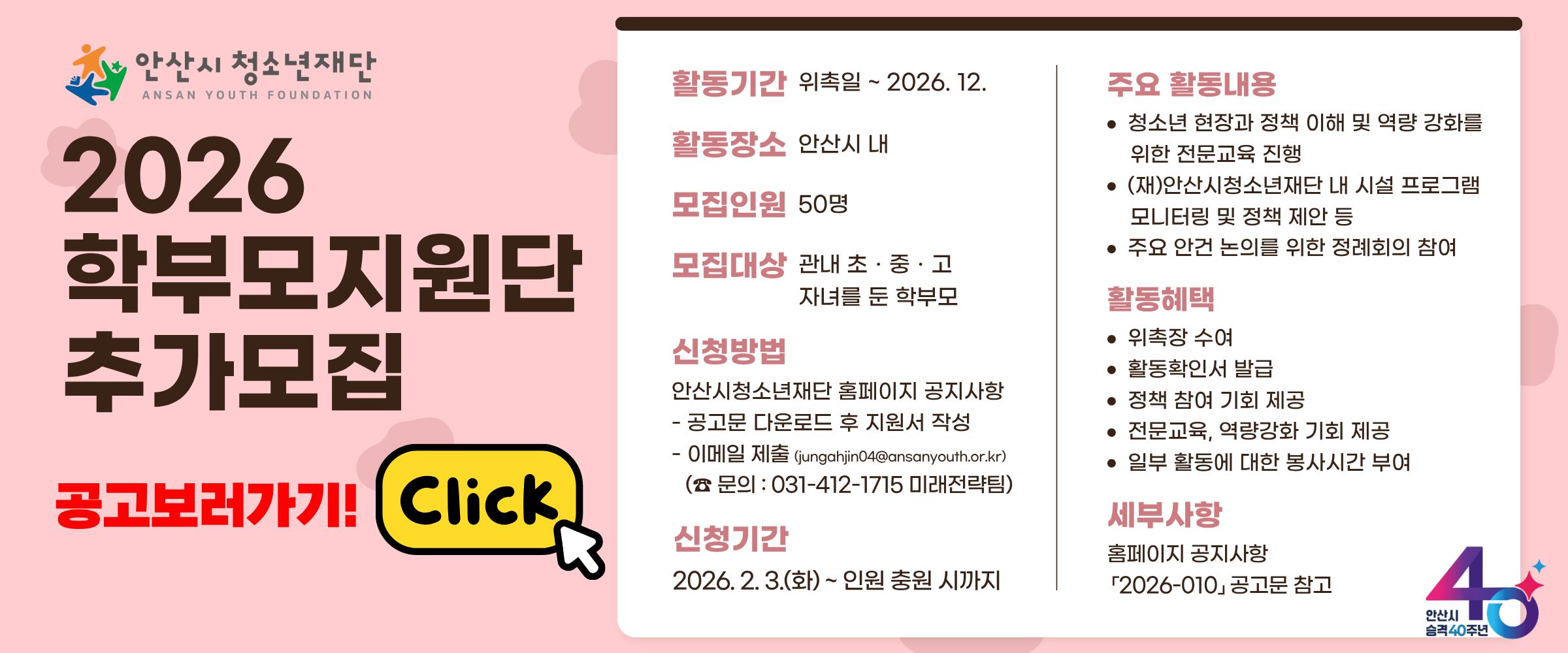 [제2026-19호] (재)안산시청소년재단 신규 직원 채용 공고<기간제근로자(육아휴직대체인력, 청소년자유공간지원센터, 방과후아카데미 팀장) >